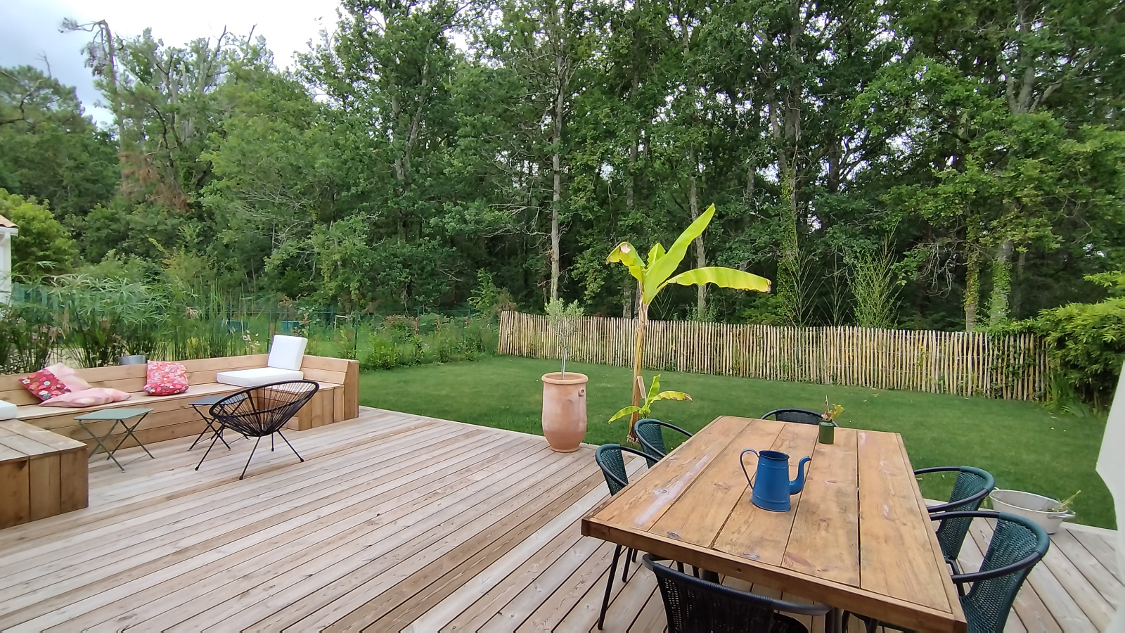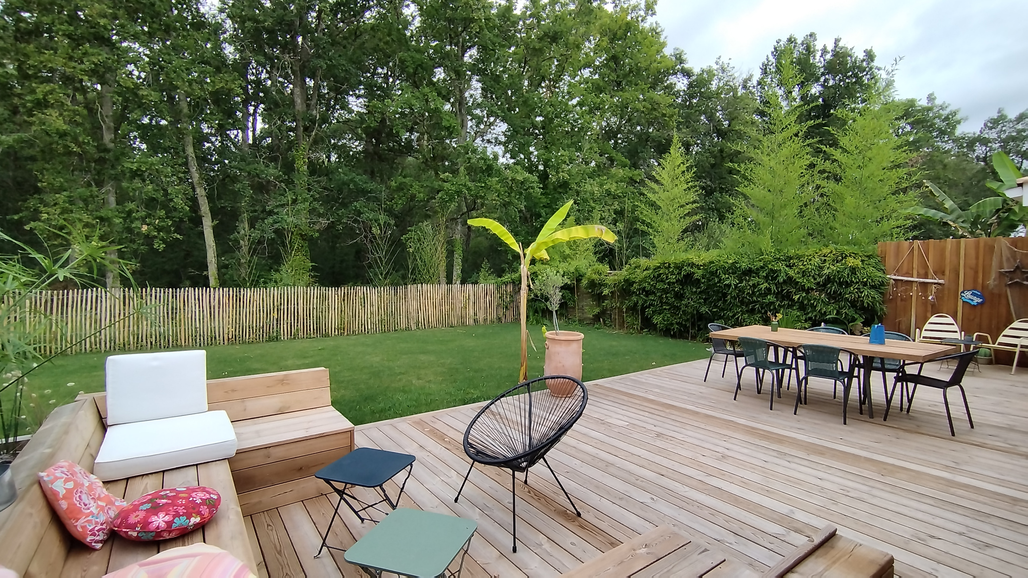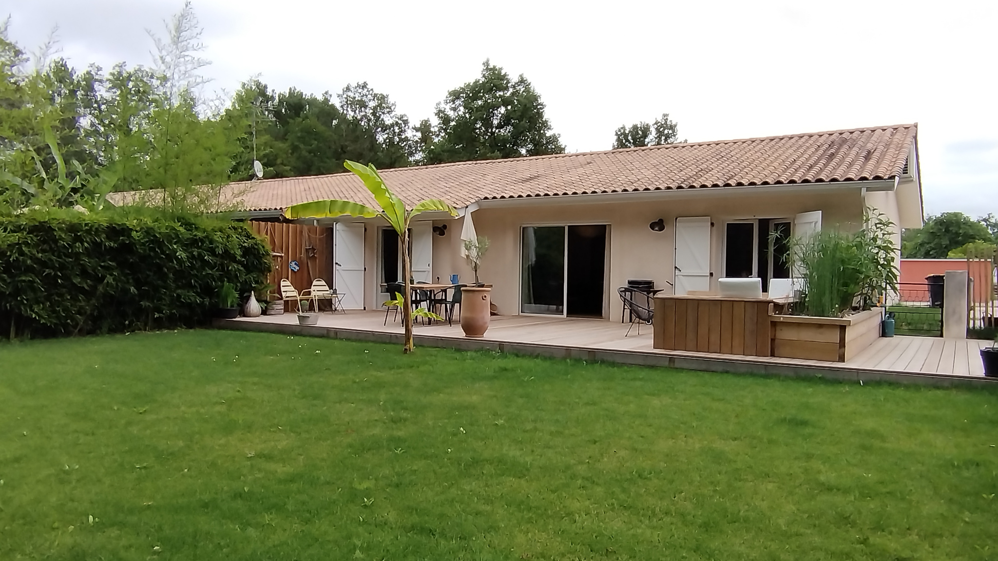 MARGAUX - CANTENAC Superbe maison de 105 m² environ, comprenant entrée avec placard, séjour lumineux donnant sur une terrasse de 70 m² environ, en bois avec bancs intégrés, 2 coins nuit séparés, avec 2 chambres équipées de placard d'un côté, sde double vasque, wc, ainsi qu'un coin parental avec chambre, placard et salle d'eau. Un garage transformé en buanderie et bureau très spacieux. De nombreuses possibilitées s'ouvrent à vous sur cette partie de la maison. Vous trouverez également un jardin clos de 466 m² environ ainsi que 3 places de parking extérieurs.